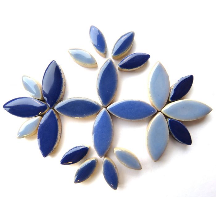 A perfectly charming pack of petal-shaped, high-fired ceramic pieces. The beautifully proportioned pointed ellipses are ideal for making a variety of shapes and forms that require curves or flowing lines found in nature. Each pack contains a random mix of molded ceramic petal forms in a variety of colours and a mixture of 3 sizes. Each petal is 5mm thick. The small petal is 14mm long and 6mm wide, the medium petal is 21mm long and 9.5mm wide, and the large petal is 25mm long and 11mm wide. Seal the back side before use in extreme weather.