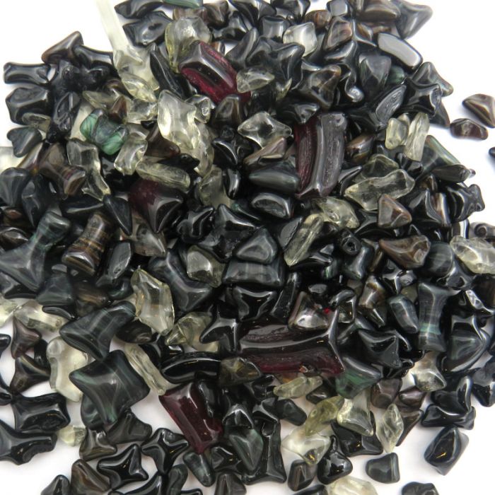 These glass cullets are remnants from the process of making Czech crystal beads. They are like the extra batter that squeezes out the side of a waffle pan! You get the same brilliant colour for a fraction of the price. Please remember that there are no holes in these glass pieces. Sizes vary from 5-15mm long and 2-4mm thick. 100g = ±300 pieces