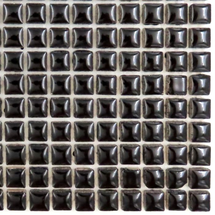 Hired-fired ceramic tile in versatile 10mm size. Each tile is 10x10x5mm with a high gloss glazed surface that is slightly domed (max. centre thickness of ±6mm). Traditional, durable, elegant and versatile, these tiles are mesh-mounted for installation on flat or curved surfaces as well as hobby projects both indoors and outdoors. UVA- and frost-resistant when used with suitable adhesive and grouts. Density and glaze making cutting difficult; best left whole.