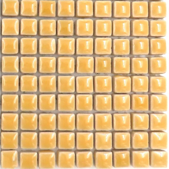 Hired-fired ceramic tile in versatile 10mm size. Each tile is 10x10x5mm with a high gloss glazed surface that is slightly domed (max. centre thickness of ±6mm). Traditional, durable, elegant and versatile, these tiles are mesh-mounted for installation on flat or curved surfaces as well as hobby projects both indoors and outdoors. UVA- and frost-resistant when used with suitable adhesive and grouts. Density and glaze making cutting difficult; best left whole.