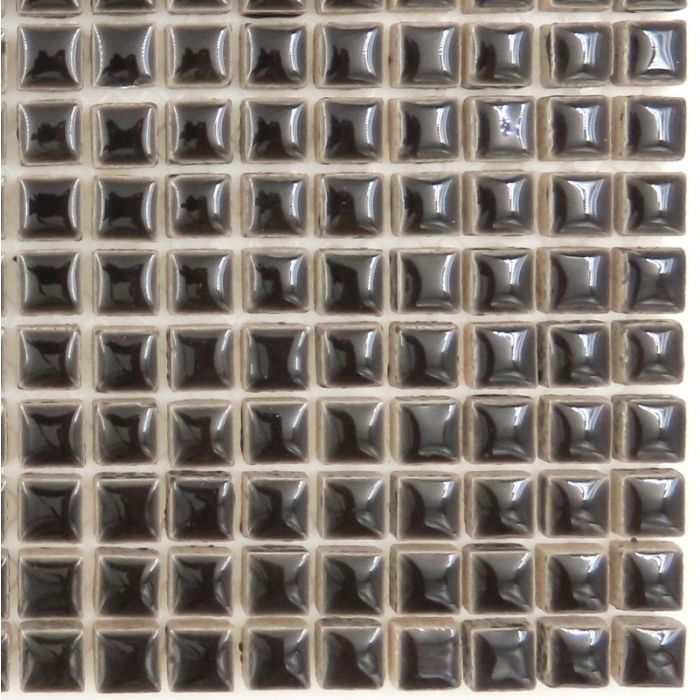 Hired-fired ceramic tile in versatile 10mm size. Each tile is 10x10x5mm with a high gloss glazed surface that is slightly domed (max. centre thickness of ±6mm). Traditional, durable, elegant and versatile, these tiles are mesh-mounted for installation on flat or curved surfaces as well as hobby projects both indoors and outdoors. UVA- and frost-resistant when used with suitable adhesive and grouts. Density and glaze making cutting difficult; best left whole.