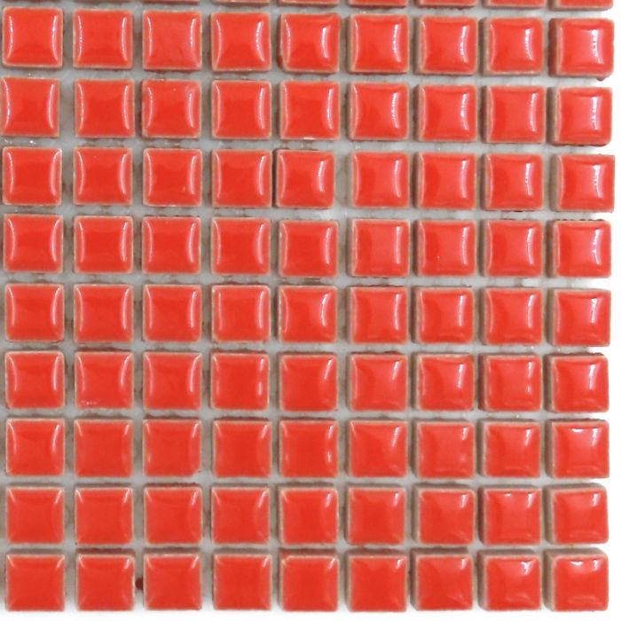 Hired-fired ceramic tile in versatile 10mm size. Each tile is 10x10x5mm with a high gloss glazed surface that is slightly domed (max. centre thickness of ±6mm). Traditional, durable, elegant and versatile, these tiles are mesh-mounted for installation on flat or curved surfaces as well as hobby projects both indoors and outdoors. UVA- and frost-resistant when used with suitable adhesive and grouts. Density and glaze making cutting difficult; best left whole.