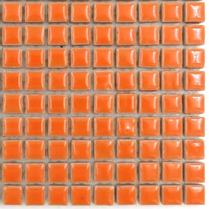 Hired-fired ceramic tile in versatile 10mm size. Each tile is 10x10x5mm with a high gloss glazed surface that is slightly domed (max. centre thickness of ±6mm). Traditional, durable, elegant and versatile, these tiles are mesh-mounted for installation on flat or curved surfaces as well as hobby projects both indoors and outdoors. UVA- and frost-resistant when used with suitable adhesive and grouts. Density and glaze making cutting difficult; best left whole.