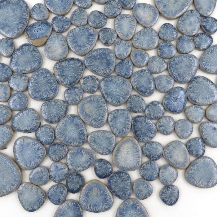 Loose pebble-shaped tiles in varying sizes; high-fired from premium clay with a frost- and scratch-resistant glaze, optimizing them for use indoors and outside for all seasons. 500g=+/-50pieces.