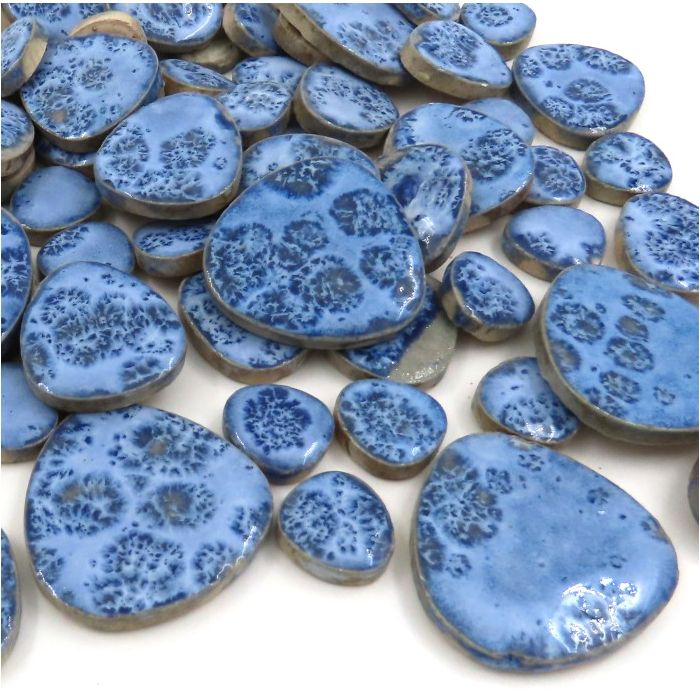 Loose pebble-shaped tiles in varying sizes; high-fired from premium clay with a frost- and scratch-resistant glaze, optimizing them for use indoors and outside for all seasons. 500g=+/-50pieces.
