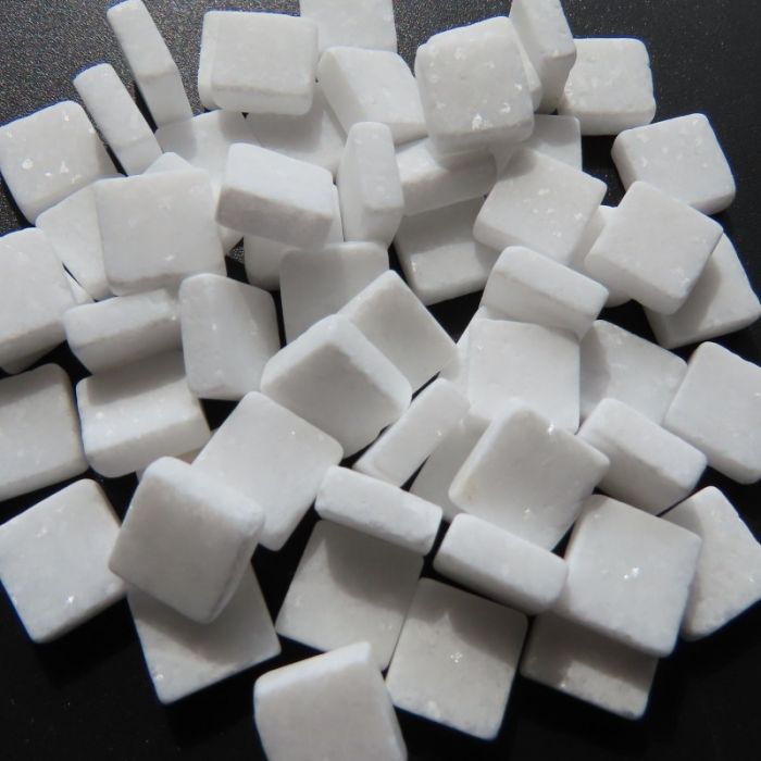 Although these tiles are thinner than the cubes, remember they are natural stone and crystalline in structure so cutting precisely may take time to master—for best results, use the wheeled porcelain nipper from Rubi; other wheeled cutters may be used but the wheels will need changing more frequently. Always seal with beeswax or stone sealant BEFORE grouting as coloured grout may stain the tesserae. Each is 10×10 mm and 4mm thick.