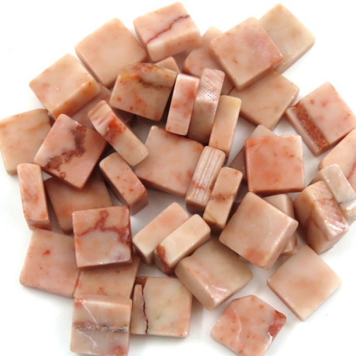 Although these tiles are thinner than the cubes, remember they are natural stone and crystalline in structure so cutting precisely may take time to master—for best results, use the wheeled porcelain nipper from Rubi; other wheeled cutters may be used but the wheels will need changing more frequently. Always seal with beeswax or stone sealant BEFORE grouting as coloured grout may stain the tesserae. Each is 10×10 mm and 4mm thick.