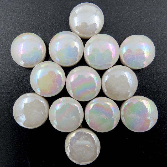 A wonderful round tile that is hand molded and glazed with multiple layers of crackle glass and then acid washed for a permanent pearlised gloss. The gold and silver are electroplated with an antique acid wash finish. Spectacular in combination with matte glass or stone tiles as well as standard ceramic tesserae. As this product is hand made in metal mols the size may vary slightly due to shrinkage, most are between 16-18mm in diameter. This shrinkage also leads to a slight swelling giving a domed or rounded aspect with the centre of each tile slightly thicker than the edges, the thickness is +/-6mm. The edges are straight and well defined. The glaze is hand painted in a minimum of 3 layers giving a beautiful luster with the colour lighter on the egdges and deeper in the center. During rapid cooling the craquelé occurs for a highly desirable artistic effect. Finally to create a permanent mother of pearl effect the tiles are soaked in a strong acid to etch the surface.