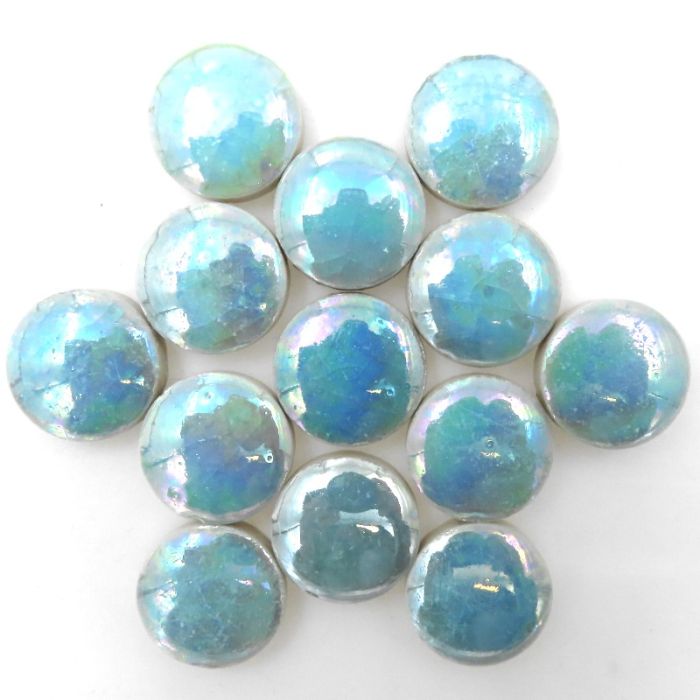 A wonderful round tile that is hand molded and glazed with multiple layers of crackle glass and then acid washed for a permanent pearlised gloss. The gold and silver are electroplated with an antique acid wash finish. Spectacular in combination with matte glass or stone tiles as well as standard ceramic tesserae. As this product is hand made in metal mols the size may vary slightly due to shrinkage, most are between 16-18mm in diameter. This shrinkage also leads to a slight swelling giving a domed or rounded aspect with the centre of each tile slightly thicker than the edges, the thickness is +/-6mm. The edges are straight and well defined. The glaze is hand painted in a minimum of 3 layers giving a beautiful luster with the colour lighter on the egdges and deeper in the center. During rapid cooling the craquelé occurs for a highly desirable artistic effect. Finally to create a permanent mother of pearl effect the tiles are soaked in a strong acid to etch the surface.