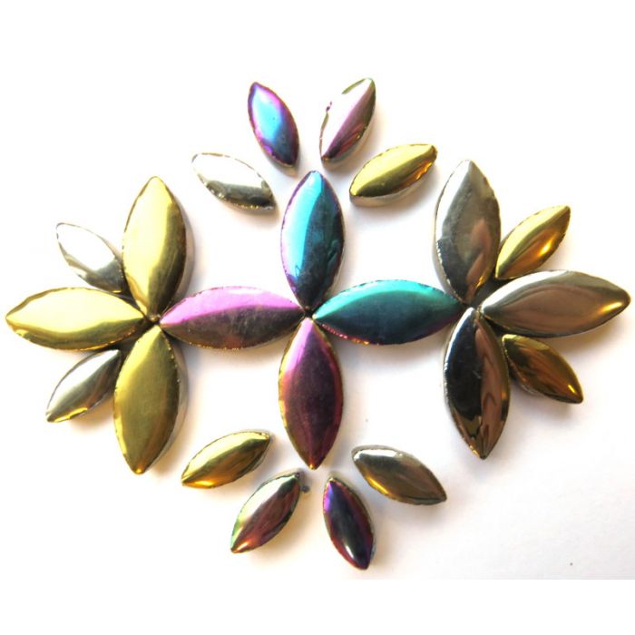 A perfectly charming pack of petal-shaped, high-fired ceramic pieces. The beautifully proportioned pointed ellipses are ideal for making a variety of shapes and forms that require curves or flowing lines found in nature. Each pack contains a random mix of molded ceramic petal forms in a variety of colours and a mixture of 3 sizes. Each petal is 5mm thick. The small petal is 14mm long and 6mm wide, the medium petal is 21mm long and 9.5mm wide, and the large petal is 25mm long and 11mm wide. Seal the back side before use in extreme weather.