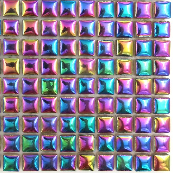 Hired-fired ceramic tile in versatile 10mm size. Each tile is 10x10x5mm with a high gloss glazed surface that is slightly domed (max. centre thickness of ±6mm). Traditional, durable, elegant and versatile, these tiles are mesh-mounted for installation on flat or curved surfaces as well as hobby projects both indoors and outdoors. UVA- and frost-resistant when used with suitable adhesive and grouts. Density and glaze making cutting difficult; best left whole.