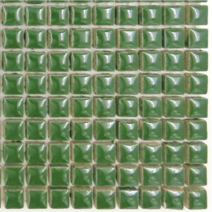 Hired-fired ceramic tile in versatile 10mm size. Each tile is 10x10x5mm with a high gloss glazed surface that is slightly domed (max. centre thickness of ±6mm). Traditional, durable, elegant and versatile, these tiles are mesh-mounted for installation on flat or curved surfaces as well as hobby projects both indoors and outdoors. UVA- and frost-resistant when used with suitable adhesive and grouts. Density and glaze making cutting difficult; best left whole.
