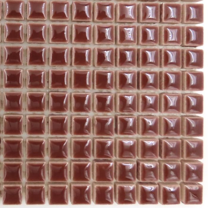 Hired-fired ceramic tile in versatile 10mm size. Each tile is 10x10x5mm with a high gloss glazed surface that is slightly domed (max. centre thickness of ±6mm). Traditional, durable, elegant and versatile, these tiles are mesh-mounted for installation on flat or curved surfaces as well as hobby projects both indoors and outdoors. UVA- and frost-resistant when used with suitable adhesive and grouts. Density and glaze making cutting difficult; best left whole.