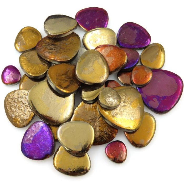 Loose pebble-shaped tiles in varying sizes; high-fired from premium clay with a frost- and scratch-resistant glaze, optimizing them for use indoors and outside for all seasons. High fired ceramic electroplated with a chrome based metallic layer, these may be used outside but pitting or chipping is a risk in high traffic areas. 500g=+/-50pieces.