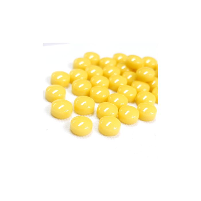 Opaque 12mm Optic Drops with a gloss finish. Each one is a perfect circle; uniform in size, shape, and finish. We do not recommend cutting as the rounded surfaces make it difficult to get a clean line. These sintered glass drops have a flat base and rounded centre, with a 12mm in diameter, 5-6mm thick edge, and an 8mm thick centre.