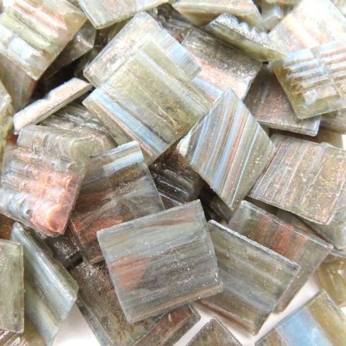 Superior quality vitreous glass mosaic from the same factory as Bisazza. 196 tiles, paper mounted on a sheet of 30×30 cm; each tile is 20mm² and 4mm thick. 11 sheets = 1m² . Each sheet weighs approx. 700g. High-temperature vitreous glass. UVA- and frost-resistant. Suitable for pools, spas, bathrooms, walls, and floors. Marbled effect acheieved by mixing molten glass in multiple colours. Some transparency may occur within individual tiles. Smooth, slightly striated finish on the surface.