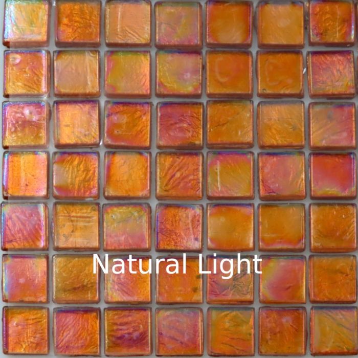 This line is a reproduction based on Sicis Colibri Iridised but is much more affordable; the molded transparent glass has metallic foil heat-bonded to the back to produce a vivid, mirror-like reflective tile. As the colour of the glass is actually reflected, it is frost-proof and UVA-resistant; it may, however, experience some colour change or spotting in direct sunlight or when exposed to chlorine or salt. The tiles may be cut but care must be taken that the foil is not damaged behind during cutting. Each tile is 15mm² and 3.5mm thick. 1 sheet = 400 tiles (32.7×32.7cm); 9.4 sheets = 1m².