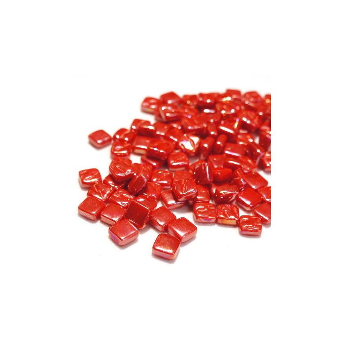 Stamped mini glass tiles (8x8x4mm). 50g contains approximately 80 tiles and covers about 8cm²; therefore, 1kg = ±1600 tiles (0.2m²), and 5kg = ±1m². Perfect for Pixel Mosaic. These glass tiles have a COE of 84-87 and may be tacked easily to float glass. Full fusing results in a grainy surface and blurry edges so, is not recommended.