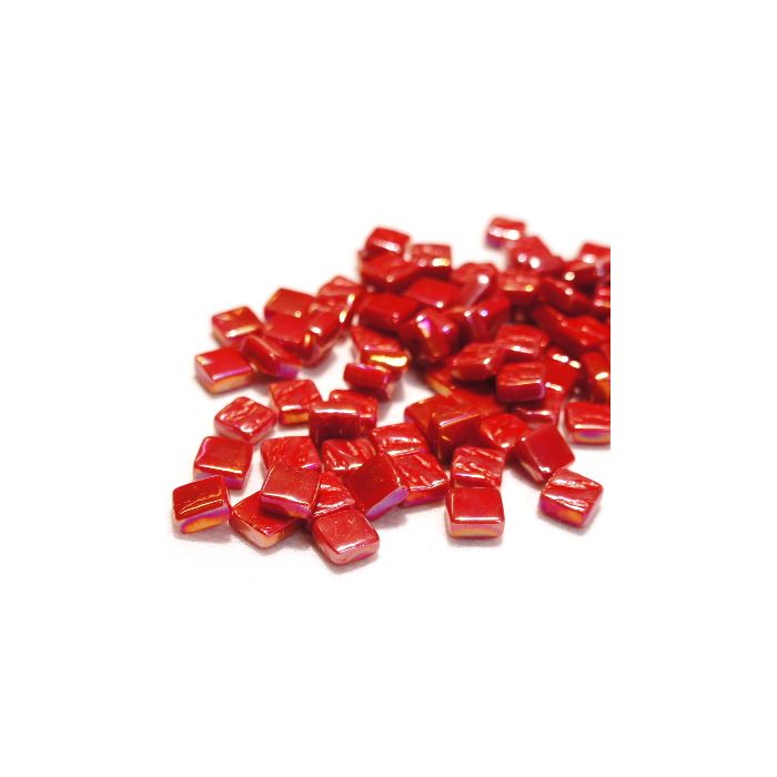 Stamped mini glass tiles (8x8x4mm). 50g contains approximately 80 tiles and covers about 8cm²; therefore, 1kg = ±1600 tiles (0.2m²), and 5kg = ±1m². Perfect for Pixel Mosaic. These glass tiles have a COE of 84-87 and may be tacked easily to float glass. Full fusing results in a grainy surface and blurry edges so, is not recommended.