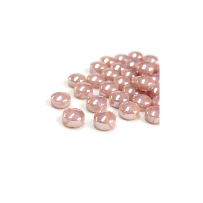 Opaque 12mm Optic Drops with an iridescent finish. Each one is a perfect circle; uniform in size, shape, and finish. We do not recommend cutting as the rounded surfaces make it difficult to get a clean line. These sintered glass drops have a flat base and rounded centre, with a 12mm in diameter, 5-6mm thick edge, and an 8mm thick centre.