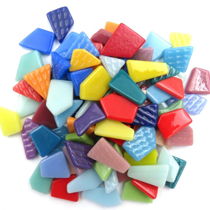 Angled polygons of molded sintered glass in gorgeous saturated colours. Just 4mm thick, they are a perfect infill choice with large or small Ottoman tiles. As a result of the sintering process, the tiles are exceptionally strong and durable and can be used outside in extreme conditions with no cracking or fading. All 4mm thick. Ranging from 1,2 to 2,5cm. 500g = ±260 pieces・1m² = ±6.25kg