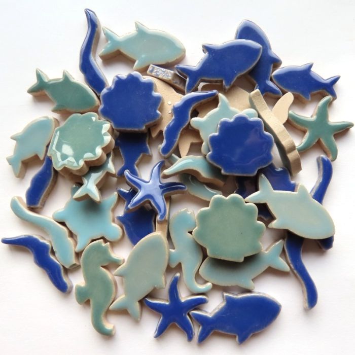 A coral reef awaits with fish, shells, turtles, starfish and seahorses....Add a watery back ground to create an instant aquarium. Perfect for murals, picture frames and vases...These ceramic forms are low fired and need to be sealed if used in freezing conditions outside. They are high gloss glazed and are UV stable so no fading with occur over time.