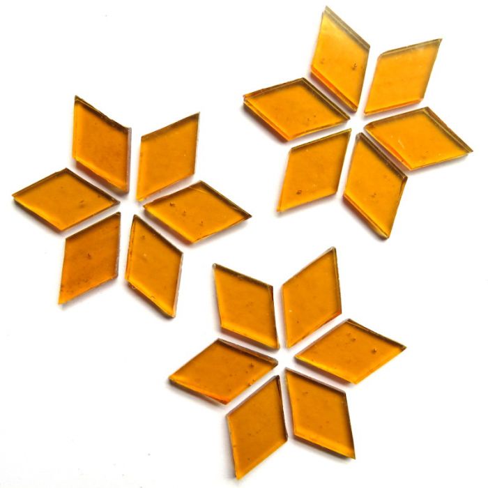 Diamonds cut from Tiffany stained glass, measuring 24×15×3 mm. Due to the artisanal manufacturing process, actual items may not perfectly match the photos. Please remember that stained glass is more fragile than vitreous or sintered mosaic. 25g = ±20 pieces・250g = ±200 pieces