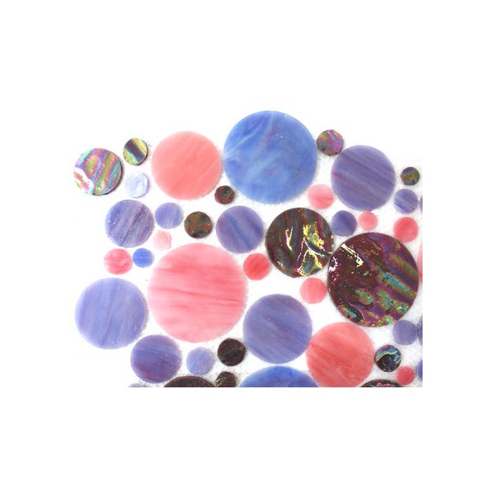 Hand-cut circles of mineral-coloured Tiffany glass in a mixture of five diameters ranging from 15mm to 50mm, in coordinated colours and finishes. Mounted on film sheets for easy removal; simply peel off. Perfect for adding circular and semi circular elements to your mosaic design, such as bubbles, leaves, petals and nature forms. Especially designed for all the mosaic artist who loves the beauty of stained glass but not the work to cut those giant sheets down to tesserae.