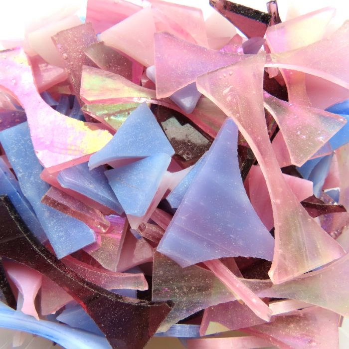 Stained glass offcuts from our small and large petals, diamonds and squares; great value for backgrounds! Please note that the sizes and shapes of the offcuts vary widely and are not consistent or predictable this is why they are discounted heavily.