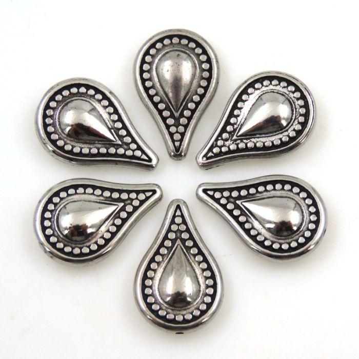 Machine cast acrylic with silver tone electrocoating, attractive teardrop shape with Tibetan bead detailing.