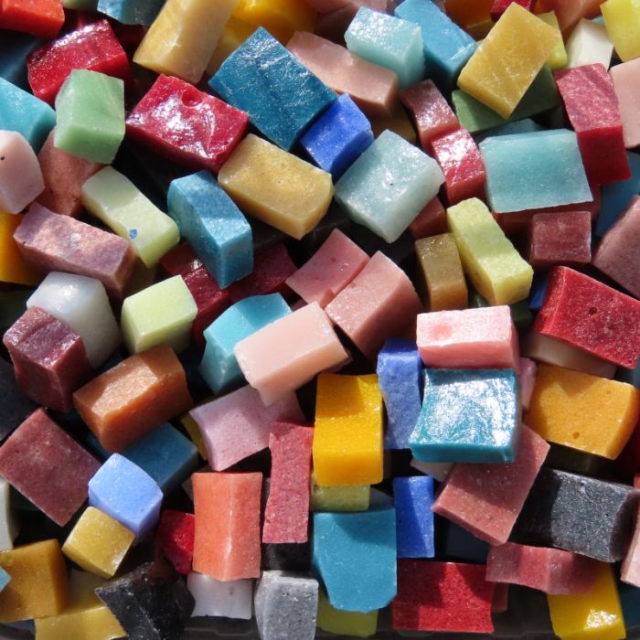 This smalti is made from a combination of recycled and natural oxides and is easy to cut using a wheeled nipper and can be applied in direct, indirect or double indirect methods. This product looks more like Antique Byzantine smalti than modern Venetian smalti. The colour tends to be more muted and the finish is more grainy with a slight translucency. The colour may show variegation through the matrix.