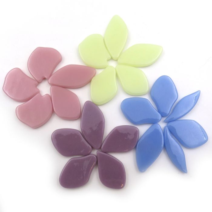 A mix of Kika's special free form petals in classic brights...250g contains approximately 80 pieces.The quantity may vary as the sizes are different. This product is 98% recycled glass and 2% mineral oxides. The forms can be cut using wheeled nippers. Sintered and vitrified these petals can be used in and out doors in all weather conditions. The sizes range from 20mm-35mm.