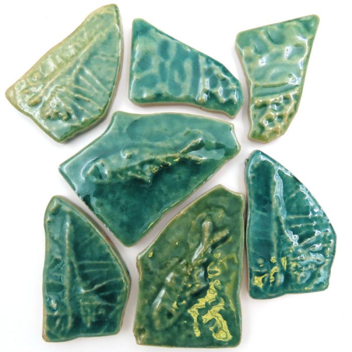 Molded puzzle shapes with embossed plant and animal based designs. The pieces range between 15-50mm (3/5-2 inches) and 6mm (1/4 inch) thick. They are low fired ceramic so need to be sealed to be weather resistant. To seal mix 1 part pVa glue with 2 parts water. Immerse the tiles for 5 minutes and then dry on a plastic sheet (garbage bag). This seals the pores and makes them more strong and frost proof.