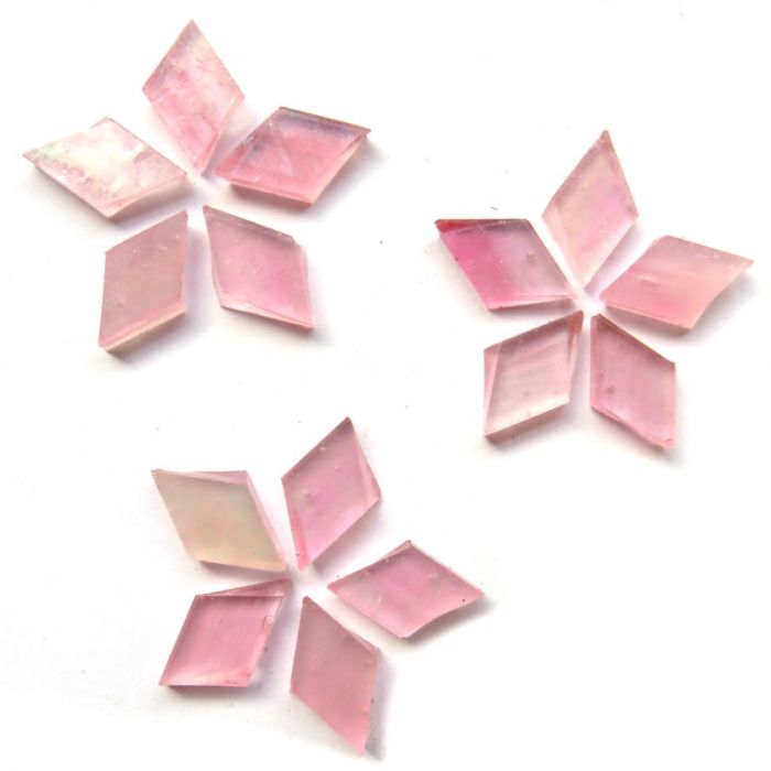 Diamonds cut from Tiffany stained glass, measuring 17×10×3 mm. Due to the artisanal manufacturing process, actual items may not perfectly match the photos. Please remember that stained glass is more fragile than vitreous or sintered mosaic. 10g = ±18 pieces・100g = ±180 pieces