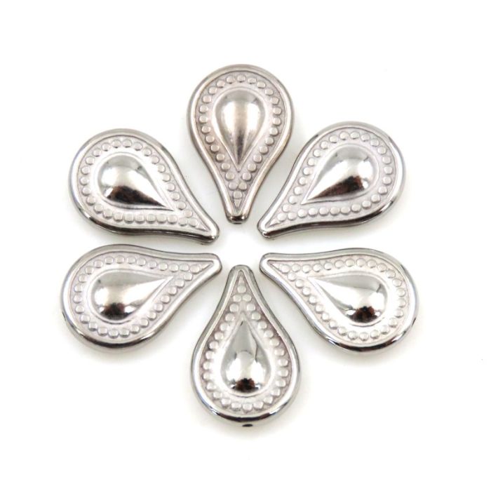 Machine cast acylic with silver tone electrocoating, attractive teardrop shape with Tibetan bead detailing.