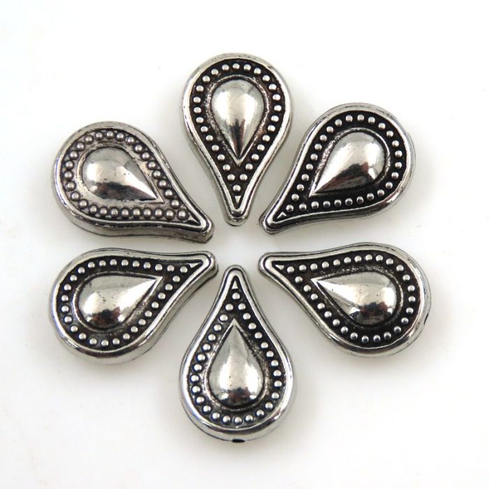 Machine cast acrylic with silver tone electrocoating, attractive teardrop shape with Tibetan bead detailing.